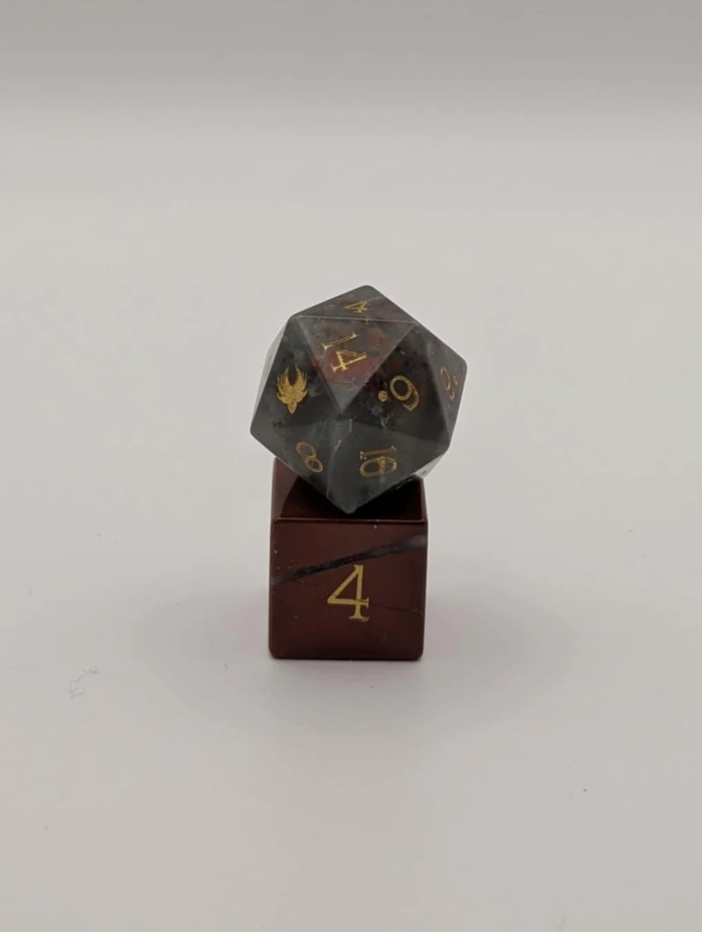 This D20 set is hewn from Bloodstone, a chalcedony quartz characterized by spots of Iron oxide. Its storm-gray base is shot through with ember-red—like a shard of magic spun from a wizard’s orbit. Gold numerals gleam against the mineral veining, and precision edges give each die the crisp, arcane geometry Ioun herself would admire. In hand it feels substantial; on the table it lands with a heavy, grounded roll that settles like a spell’s final word. Built for DnD adventurers who prize craft and consequence—warlocks and wizards, battle clerics, treasure-keen rogues. Polished faces, balanced cores, collector quality you can play hard. When initiative rises, let your Ioun Stone circle—and claim fate with authority.