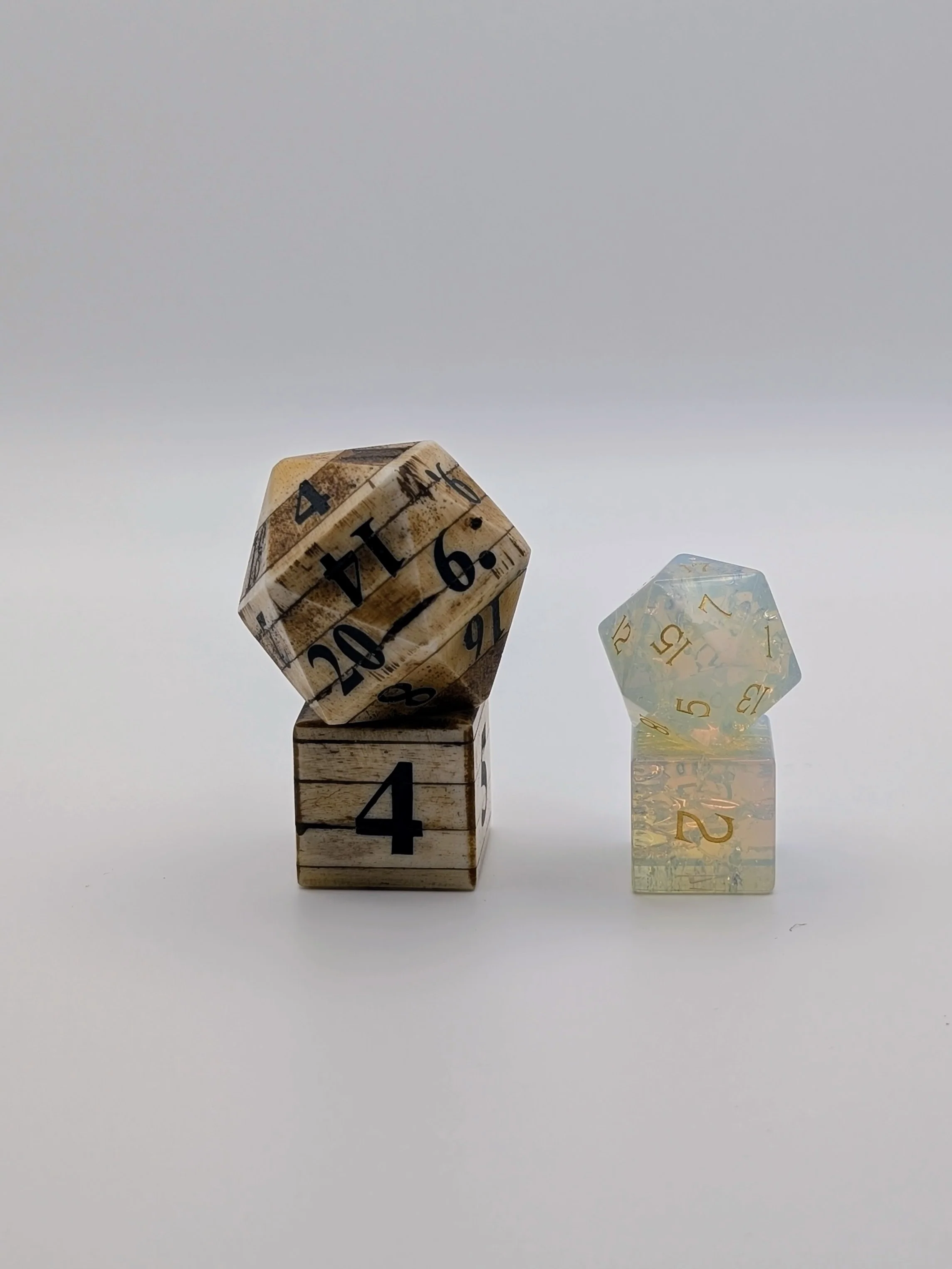 On the table they speak in a measured, satisfying clack—balanced yet heavy, rolling true with the calm certainty of good bookkeeping. This is not a novelty set; it’s a collector-grade artifact for players who prefer order over ornament, ritual over flash. Rest them in a vault, on a marble plinth, or beside your GM screen and they present as consecrated implements: bone, ink, and quiet authority.
