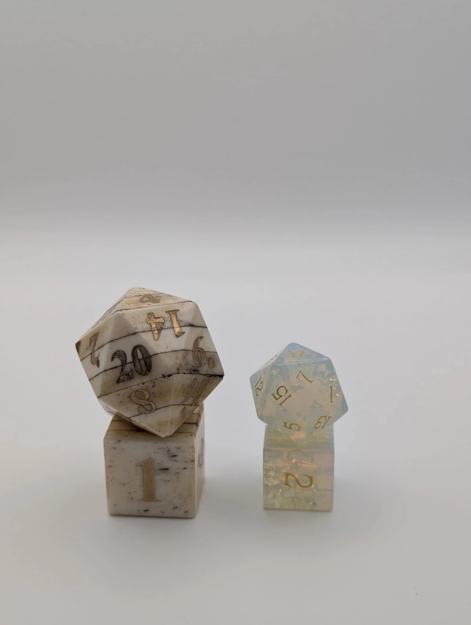 Cut from pale bone and washed in the quiet stain of ages, Myrkul’s Horde looks like it was lifted from a tyrant-king’s ossuary and crowned for play. The numerals gleam like grave-sigils—bronze inlay against ivory, each facet spidered with subtle marrow striations—so the die reads clearly without losing its relic feel.